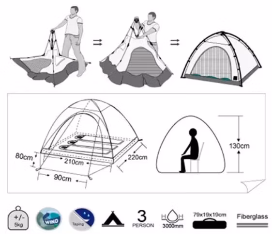 Campingtelt med plass til tre personer."Flash-touch" systemet gjør at teltet settes opp på ca 30sekunder. Ved at yttertelt, innertelt og stenger sitter festet sammen gjør det at oppsett og nedpakking går meget raskt.